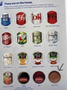この便にはhot cokeがあるのか?と言いたい気持ちを抑えて、メニューを図示し、無事オーダー完。