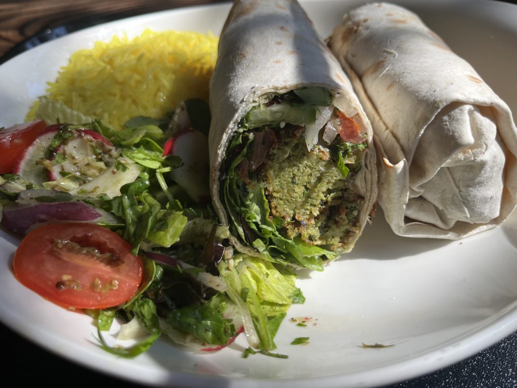 私が注文したのはファラフェルラップ(ひよこ豆のコロッケをトルティーヤで包んだみたいなもの)。