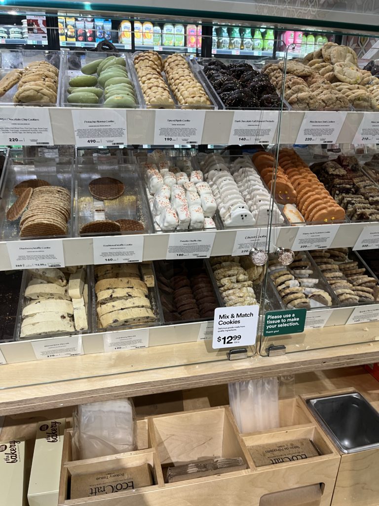 ベーカリーコーナーには量り売りのクッキーもあった。450gで13ドル(1755円)。アメリカのクッキーはずっしりしているから調子に乗って買ったらえらいことになりそう。