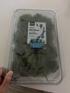 サラダ用の葉っぱのサラダほうれん草は5.99ドル/ポンド(810円)。180円/100g。