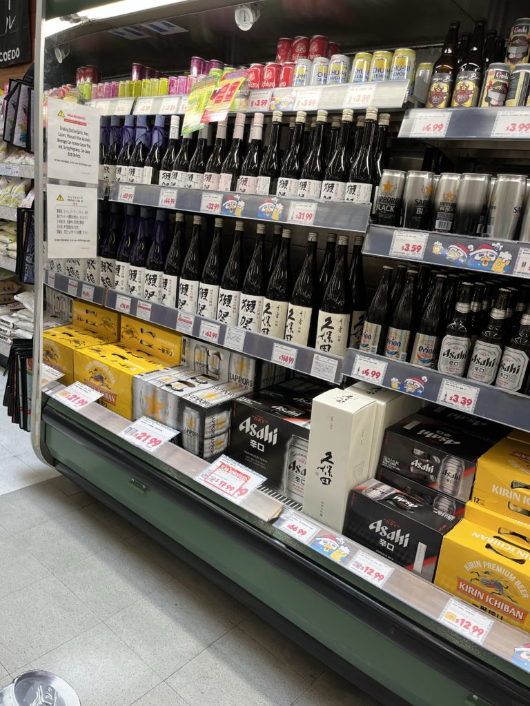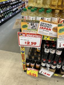 調理酒がセールになって2.59ドル(350円)。酒税の関係か?それほどお酒、みりんは高くはない印象。