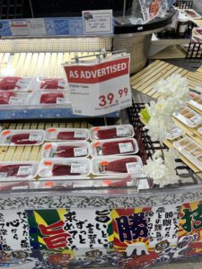 まぐろの柵はセールになって40ドル/ポンド(1200円/100g)。普通の赤身がトロ並みのお値段。