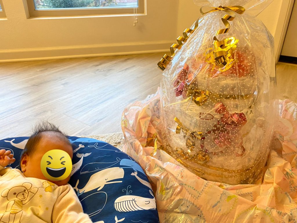第四弾は、博士太郎さんの同僚のご夫婦が家に来てくださり、オムツケーキをいただいた。