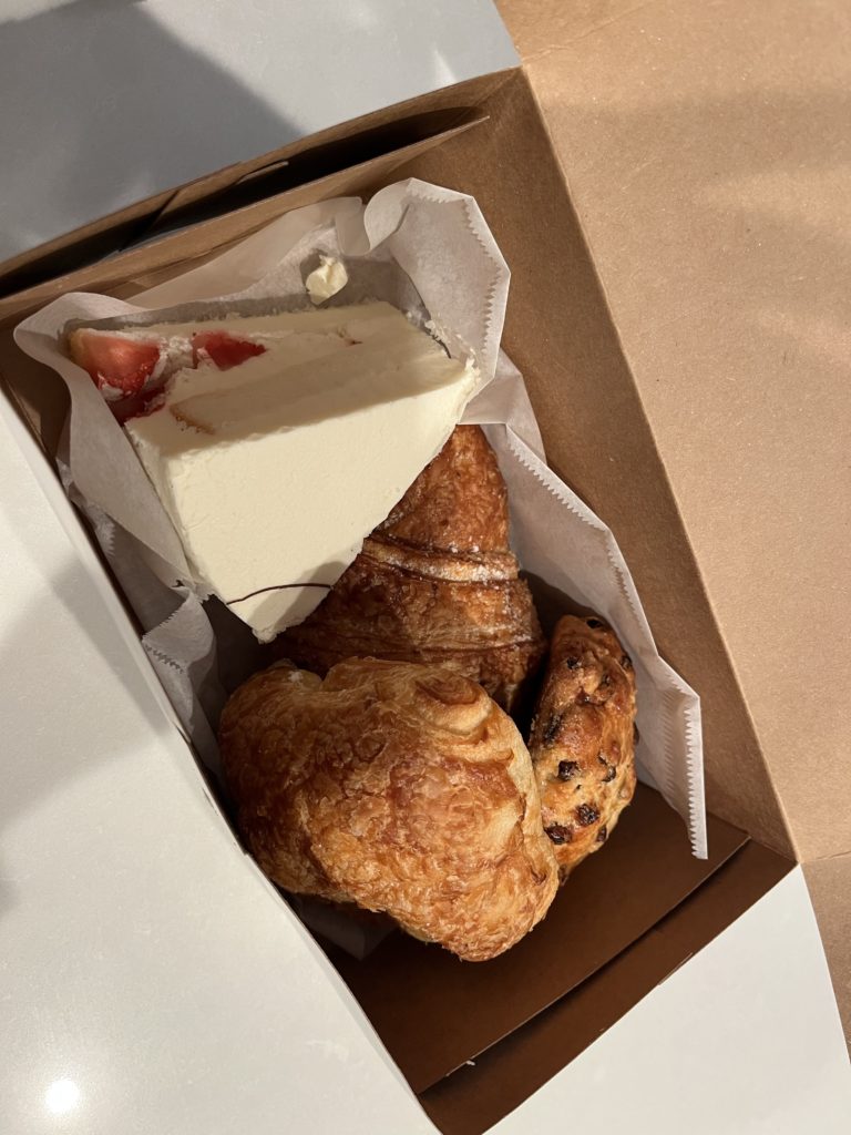 ケーキが一つ、それに大きいクロワッサン、パイ風のパン、それにスコーンのようなものが入っていた。