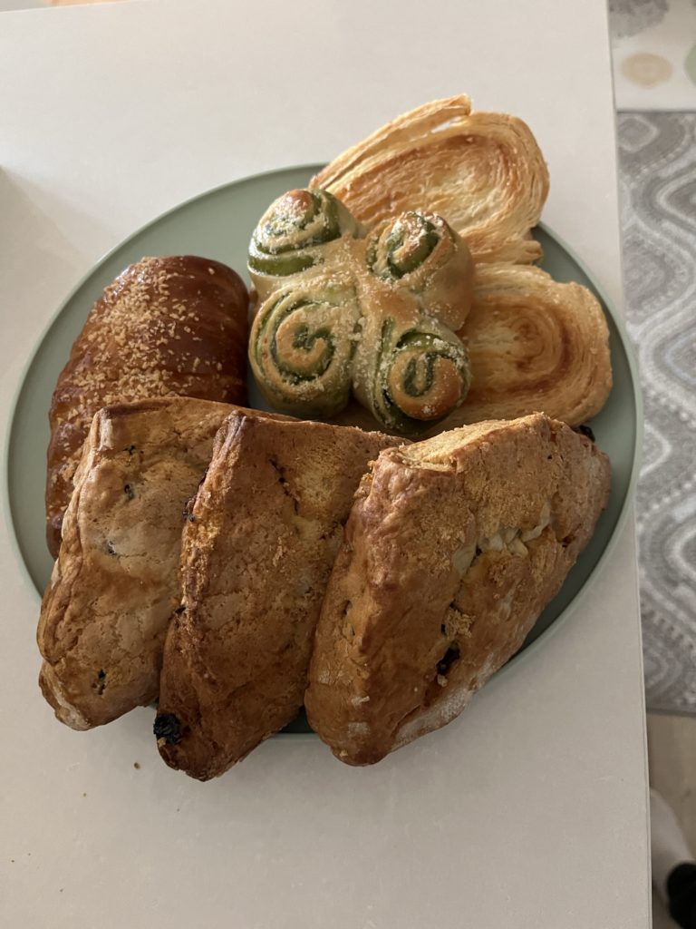 スコーン3つとウィンナーが入ったパン、ウグイス豆のパン、パイ生地のハート型のパン、計6個。