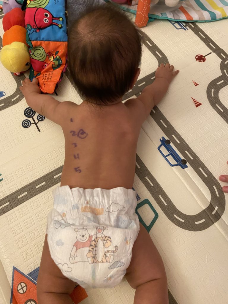 背中に1-5の番号をマジックで書かれて、なんかの薬剤みたいなのをぽつぽつと落とすものだった。