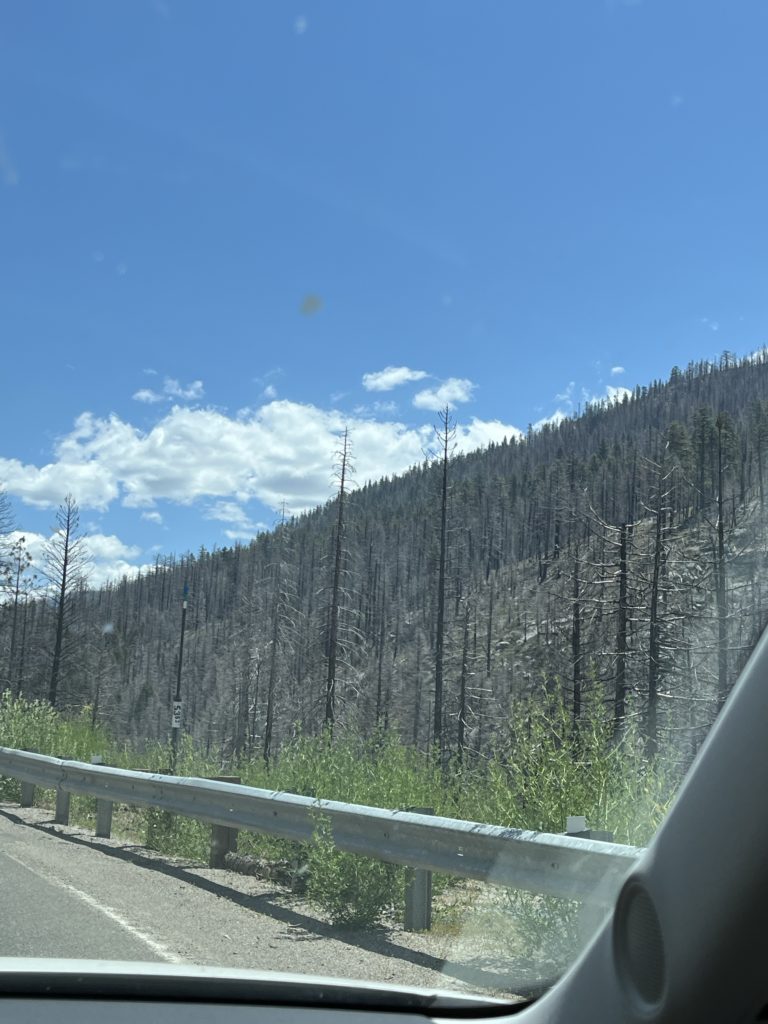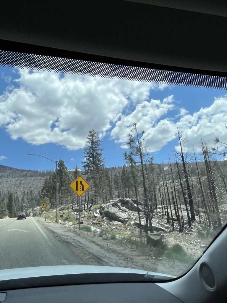 山道を抜けていくレイクタホへの道中は、もはや見慣れた風景だけれども、山火事の後が見えた。