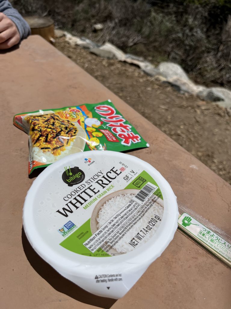 ちょうど昼時だったので、湖畔のピクニックテーブルで持ってきたご飯を食す。