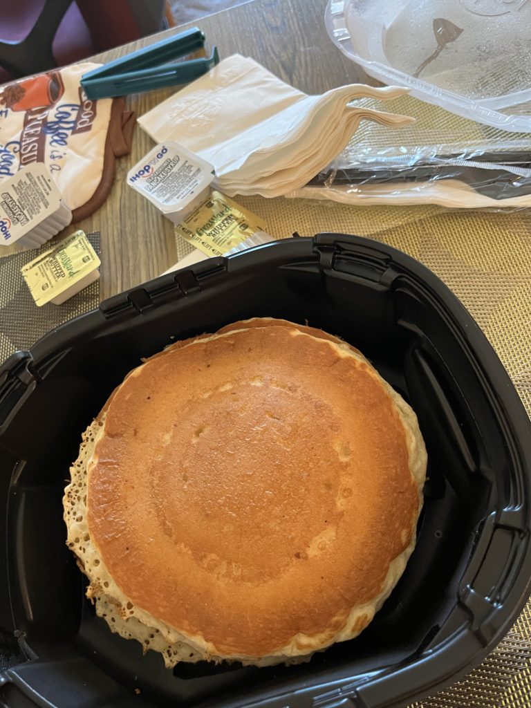ファミレスだからといってチップがかからないということもなく、パンケーキだけで10ドル近くするので行ったことがなかったが、誕生日月の間パンケーキ5枚が無料になるコインをもらえるので、テイクアウトで寄ってみた。