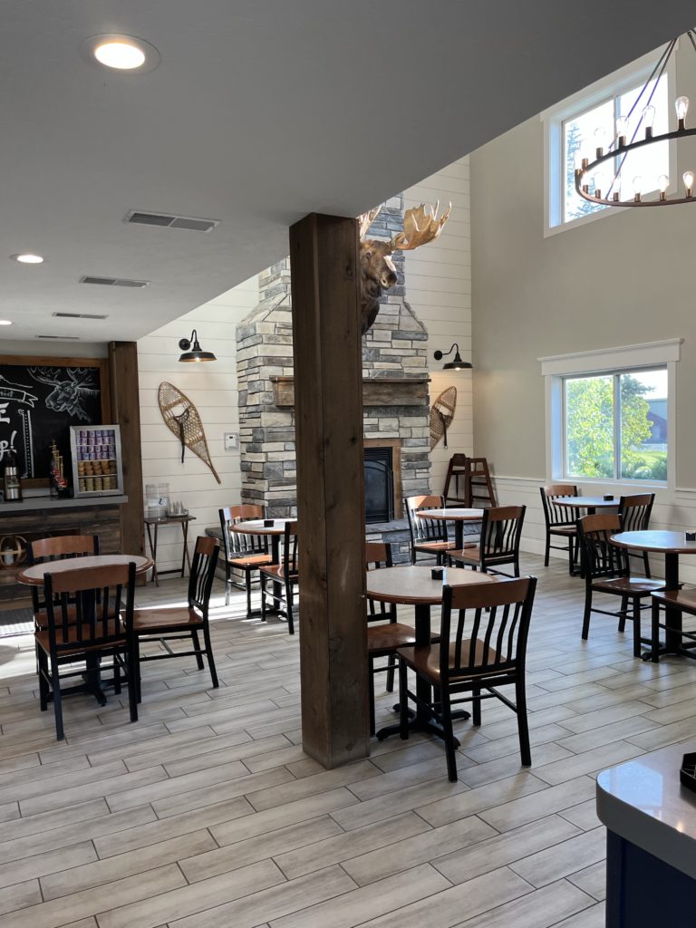 こちらは朝食の場所。ヘラジカのはく製がでかい。