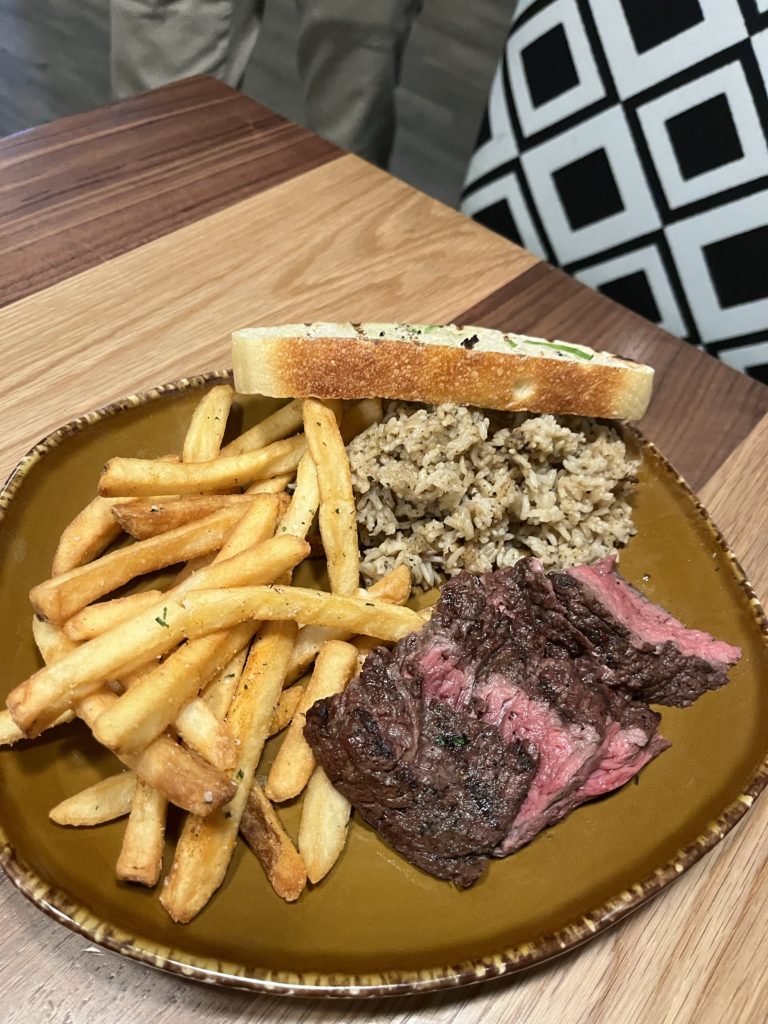 ステーキ。21ドル。サイド2品とパンがつく。サイドは選択できて私はビーツのサラダと芋にした。
