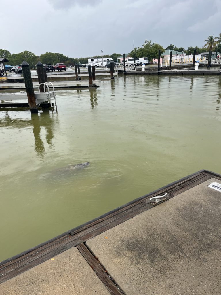 けれどもこのビジターセンターのマリーナにマナティがよく出ると聞いて、これは行かねばと傘をさしてまずは博士太郎氏が向かう。