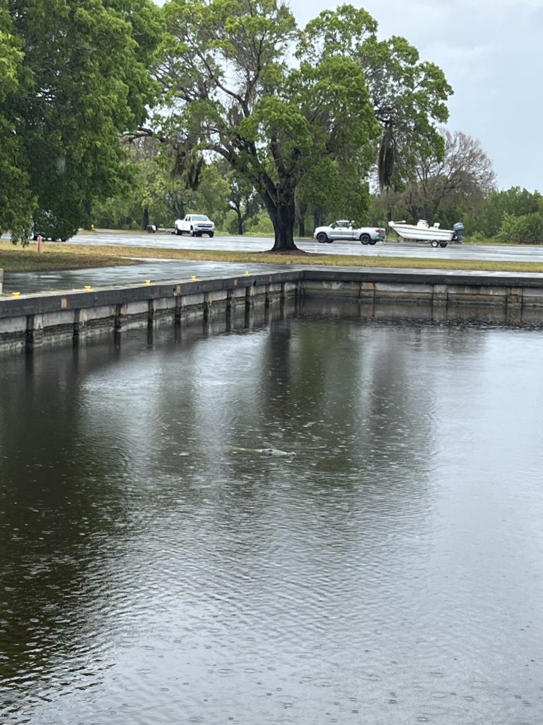 さらに車に戻るために歩いているとマリーナの水面をワニが泳ぐ姿が。けっこう大きいワニ。