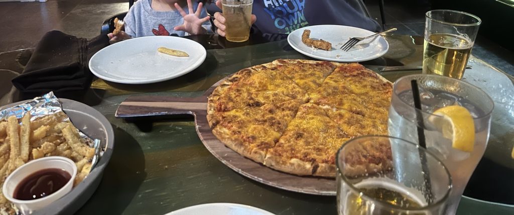 ここはチップ込みで51ドル。ピザとチキンに添えられていたポテトは食べきれず持ち帰る。そして、これは結果的に翌日の夕食になった。